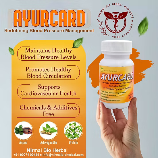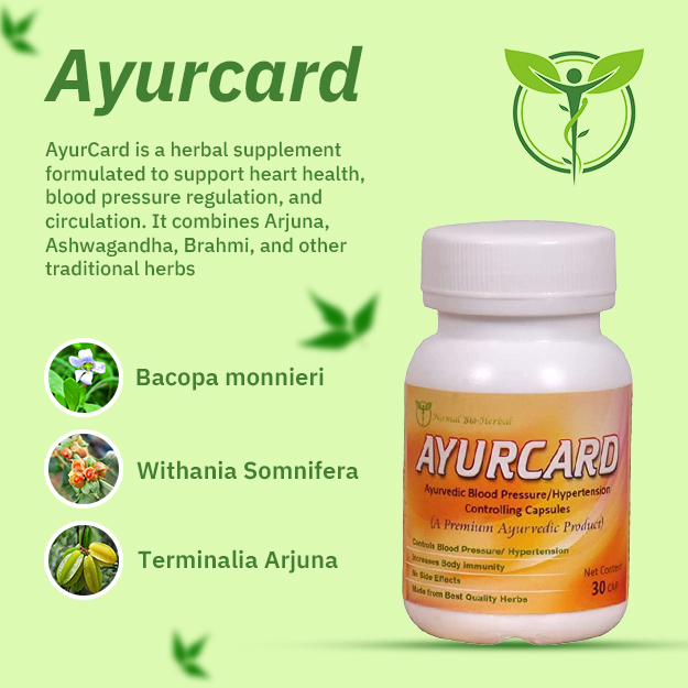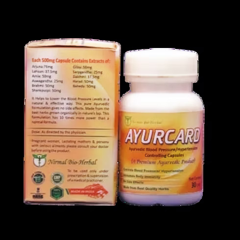 Ayurcard is a natural and herbal supplement that helps maintain healthy blood pressure levels. Made with potent ingredients like Arjuna, Ashwagandha, and Brahmi, Ayurcard supports heart health and promotes healthy circulation. This supplement is free from harmful chemicals and additives, making it safe for long-term use. Ayurcard is a convenient and effective way to support your cardiovascular health and maintain optimal blood pressure. With regular use, Ayurcard can help you feel more energized, focused, and balanced.